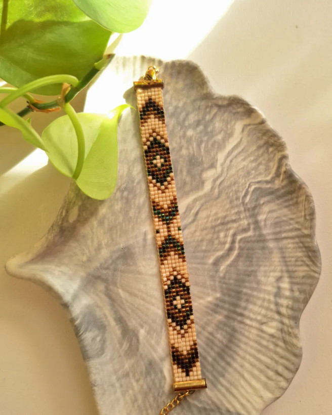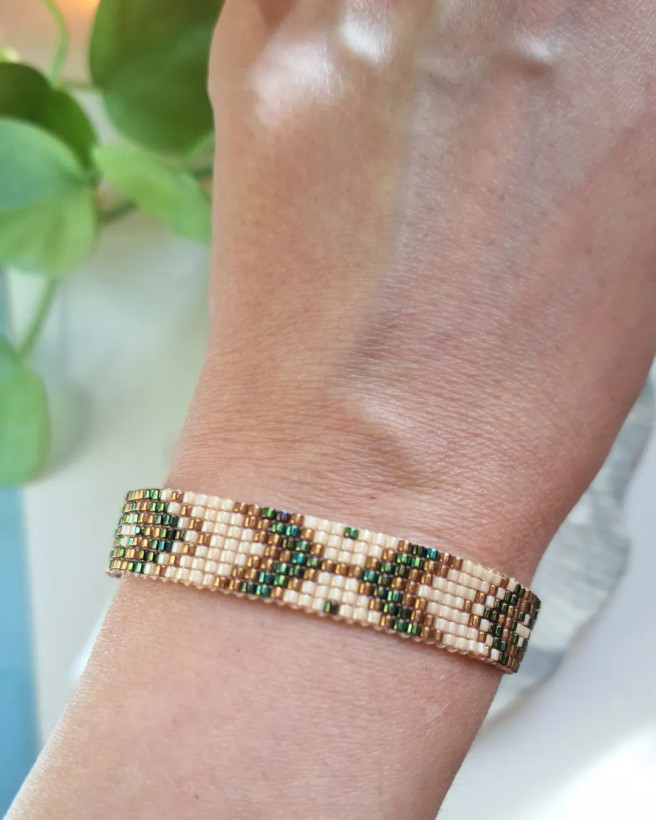دستبند زیبا و چشم نواز با رنگ های دلنشین که به استایل شما جان میبخشد. بافته شده با منجوق های میوکی اصل و بهترین متریال.