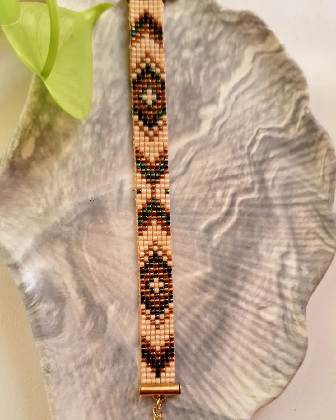 دستبند زیبا و چشم نواز با رنگ های دلنشین که به استایل شما جان میبخشد. بافته شده با منجوق های میوکی اصل و بهترین متریال.